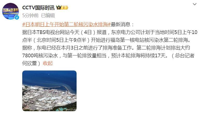 據日本TBS電視臺網站今天(4日)報道,東京電力公司計劃于當地時間5日上午10點半(北京時間5日上午9點半)開始進行福島第一核電站核污染水第二輪排海。據稱,東電已經在本月3日之前進行了排海準備工作。第二輪排海計劃排出大約7800噸核污染水,與第一輪排放量相當,預計本輪排海將持續17天。