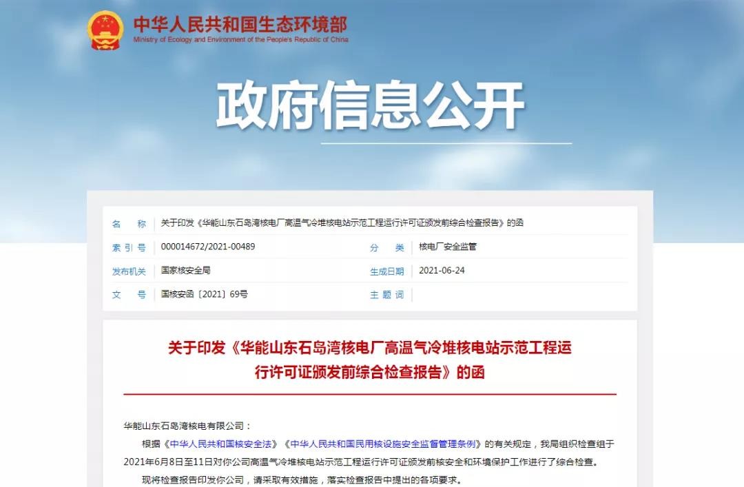 6月24日,生態環境部網站發布關于印發《華能山東石島灣核電廠高溫氣冷堆核電站示范工程運行許可證頒發前綜合檢查報告》的函。
