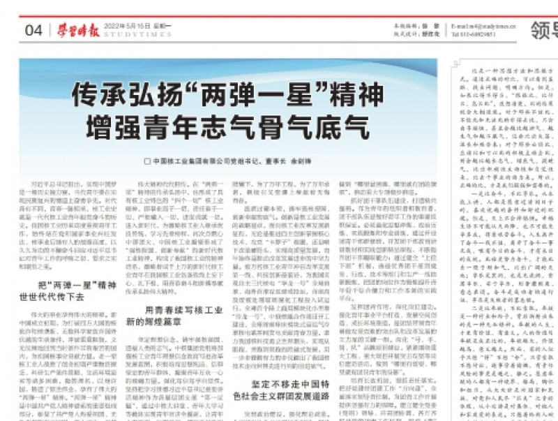 《學(xué)習(xí)時報》刊發(fā)余劍鋒署名文章 傳承弘揚“兩彈一星”精神 增強青年志氣骨氣底氣