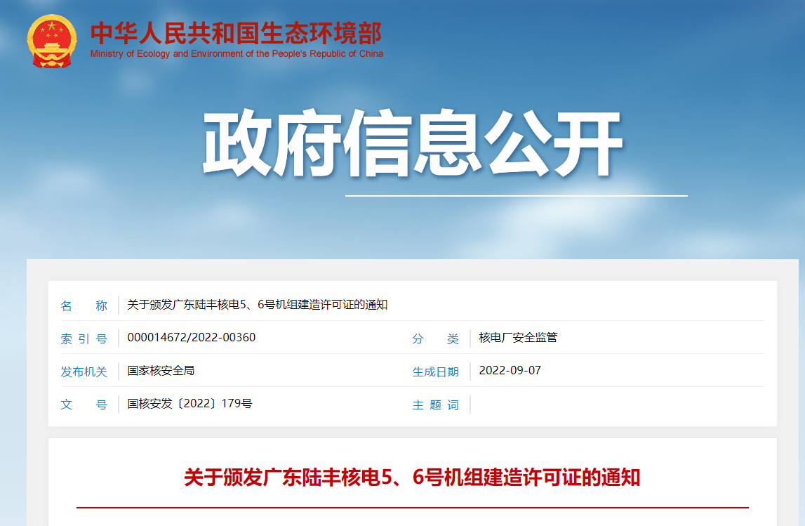 廣東陸豐核電獲頒《廣東陸豐核電5、6號機組建造許可證》