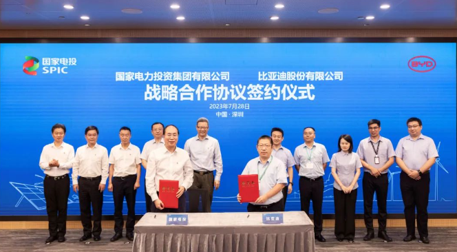7月28日,國家電投黨組書記、董事長錢智民在深圳與比亞迪股份有限公司(以下簡稱“比亞迪”)董事長兼總裁王傳福視頻會談。在錢智民與王傳福的共同見證下,國家電投總經理助理兼發展部主任侯學眾,比亞迪高級副總裁、弗迪電池董事長兼CEO何龍代表雙方簽署戰略合作協議。