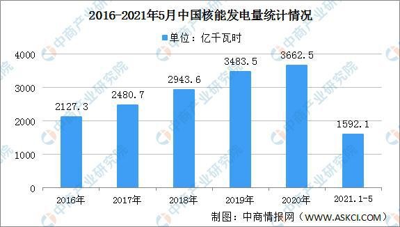 近年來,我國核能發(fā)電量持續(xù)上漲。2016年我國核能發(fā)電量2127.3億千瓦時(shí),2020年我國核能發(fā)電量3662.5億千瓦時(shí)。2021年1-5月,我國核能發(fā)電量1592.1億千瓦時(shí),同比增長(zhǎng)13.9%