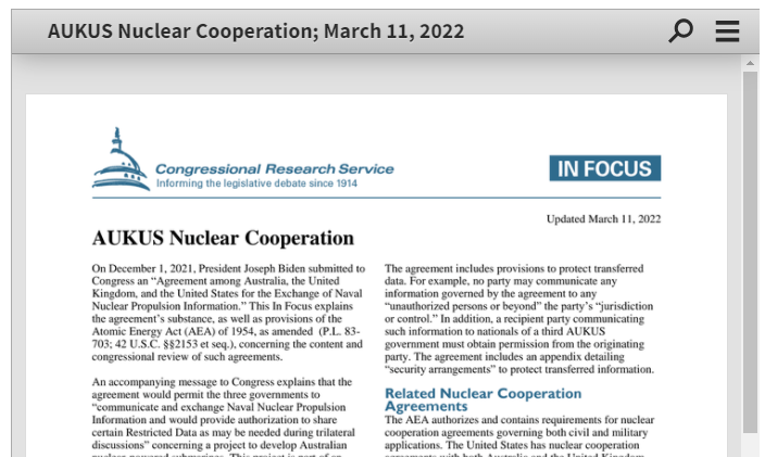 2022年3月11日,美國國會研究服務中心提交了關于美英澳合作開發核潛艇計劃的報告。該報告稱,2021年12月1日,美國總統拜登向國會提交了一份《澳大利亞、英國和美國關于交換海軍核推進信息的協議》。