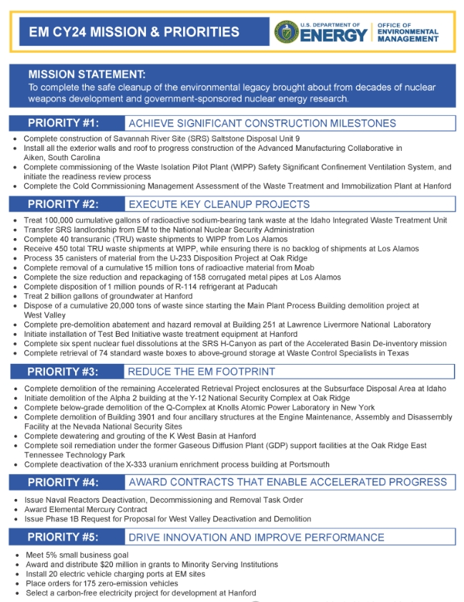 據美國核學會網站2月2日報道,美國能源部環境管理辦公室(EM)已發布2024年度清污計劃優先事項,覆蓋了關鍵的清污行動、項目建設、收購等重要活動,旨在解決美國核研究和武器開發所留下的環境遺留問題。
