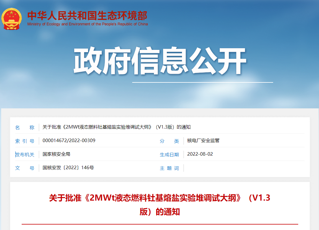 關(guān)于批準(zhǔn)《2MWt液態(tài)燃料釷基熔鹽實驗堆調(diào)試大綱》(V1.3版)的通知