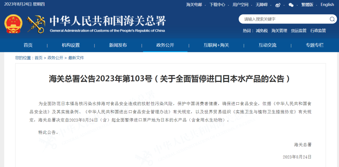 8月24日,中華人民共和國海關總署發布2023年第103號公告:為全面防范日本福島核污染水排海對食品安全造成的放射性污染風險,保護中國消費者健康,確保進口食品安全,依據《中華人民共和國食品安全法》及其實施條例、《中華人民共和國進出口食品安全管理辦法》有關規定,以及世界貿易組織《實施衛生與植物衛生措施協定》有關規定,海關總署決定自2023年8月24日(含)起全面暫停進口原產地為日本的水產品(含食用水生動物)。