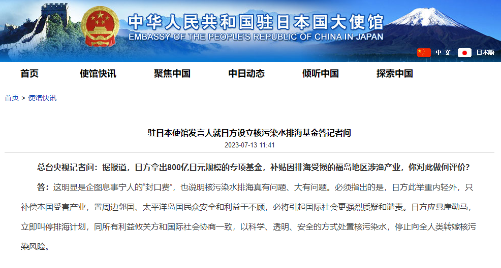 日方設(shè)立核污染水排海基金,中國(guó)駐日使館:這明顯是企圖息事寧人的“封口費(fèi)”