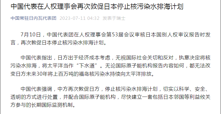 7月10日,中國代表團在人權理事會第53屆會議審核日本國別人權審議報告時發言,再次敦促日本停止核污染水排海計劃。