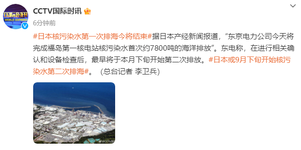 據日本產經新聞報道,“東京電力公司今天將完成福島第一核電站核污染水首次約7800噸的海洋排放”。東電稱,在進行相關確認和設備檢查后,最早將于本月下旬開始第二次排放。