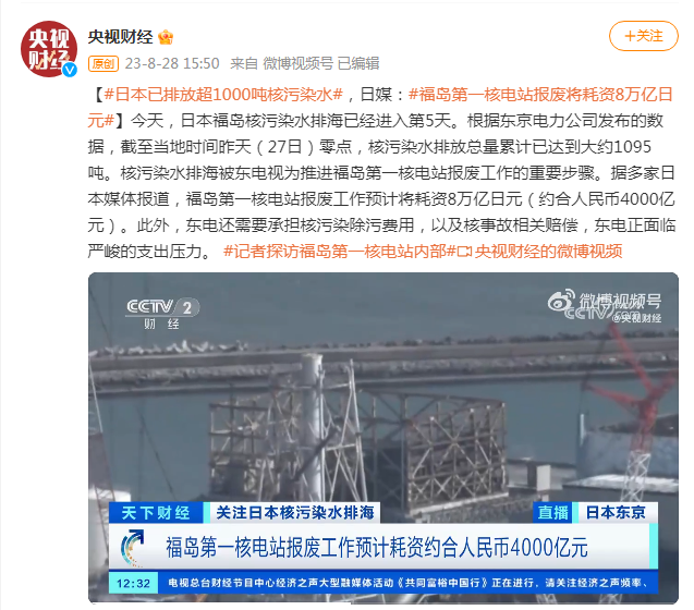 8月28日,日本福島核污染水排海已經進入第5天。根據東京電力公司發布的數據,截至當地時間昨天(27日)零點,核污染水排放總量累計已達到大約1095噸。