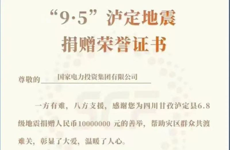 國家電投捐款1000萬元全力支援四川瀘定地震抗震救災