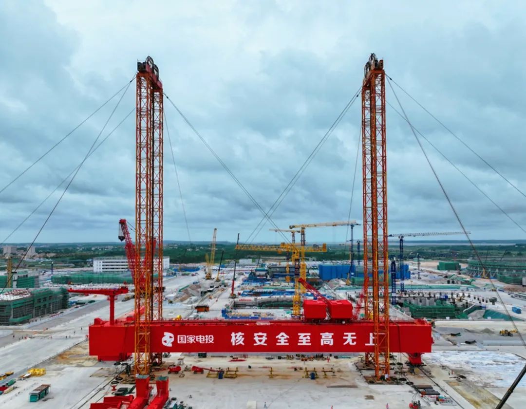 7月27日9時26分,隨著132.5米長的主梁徐徐提升至8.5米,世界核電建設領域首個大型龍門吊——國家電投廣東廉江核電1600噸龍門吊組裝第一階段提升工作順利完成,正式進入整體提升關鍵階段。
