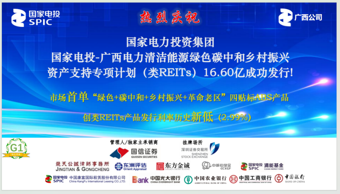 3月1日,國家電投在深交所成功發(fā)行“國家電投-廣西電力清潔能源綠色碳中和鄉(xiāng)村振興支持專項(xiàng)計(jì)劃(類REITs)”,發(fā)行規(guī)模16.60億元,發(fā)行成本2.99%,刷新類REITs產(chǎn)品自誕生以來成本最低紀(jì)錄,實(shí)現(xiàn)國家電投2024年類REITs業(yè)務(wù)開門紅。