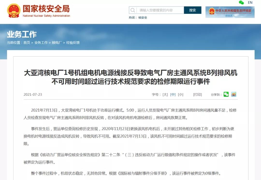 ?國家核安全局:大亞灣核電發(fā)生一起0級(jí)運(yùn)行事件
