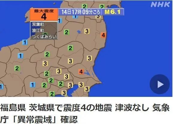 據日本放送協會(NHK)報道,當地時間14日下午5時9分,日本三重縣發生6.1級地震,福島、茨城縣最大震感為震度4,該地震暫無海嘯危險。