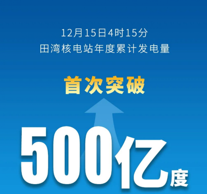 12月15日4時(shí)15分,中國(guó)核電旗下田灣核電站年度累計(jì)發(fā)電量首次突破500億度,創(chuàng)田灣核電站年度發(fā)電量歷史新高,實(shí)現(xiàn)年度發(fā)電量六連增。