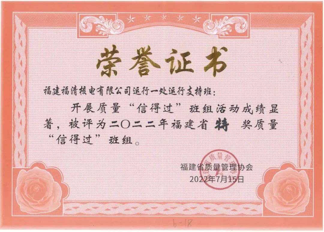 近日,中核福清核電運行一處運行支持班榮獲福建省特獎質量“信得過”班組,并被直推為全國質量“信得過”班組。