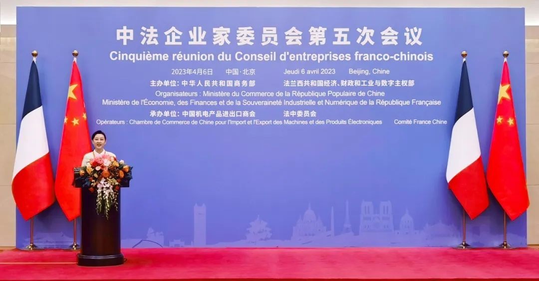 2023年4月6日,在法國(guó)總統(tǒng)馬克龍率經(jīng)貿(mào)代表團(tuán)訪華之際,中法企業(yè)家委員會(huì)第五次會(huì)議在人民大會(huì)堂舉行。習(xí)近平主席與馬克龍總統(tǒng)共同出席閉幕式并致辭。中國(guó)商務(wù)部部長(zhǎng)王文濤、法國(guó)經(jīng)財(cái)部部長(zhǎng)勒梅爾主持閉幕式。
