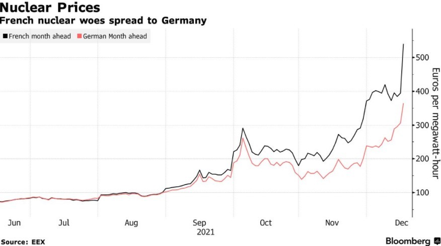 歐洲電力價格飆升至歷史新高,此前法國電力公司(Electricite de France SA)宣布,將有兩座核反應堆意外停堆,還有兩座反應堆將長期停堆,而此時正值歐洲大陸遭遇寒流,天然氣庫存已經耗盡。法國電力公司2021年12月15日表示,本周將關閉其位于 Chooz 核電站的兩座反應堆。