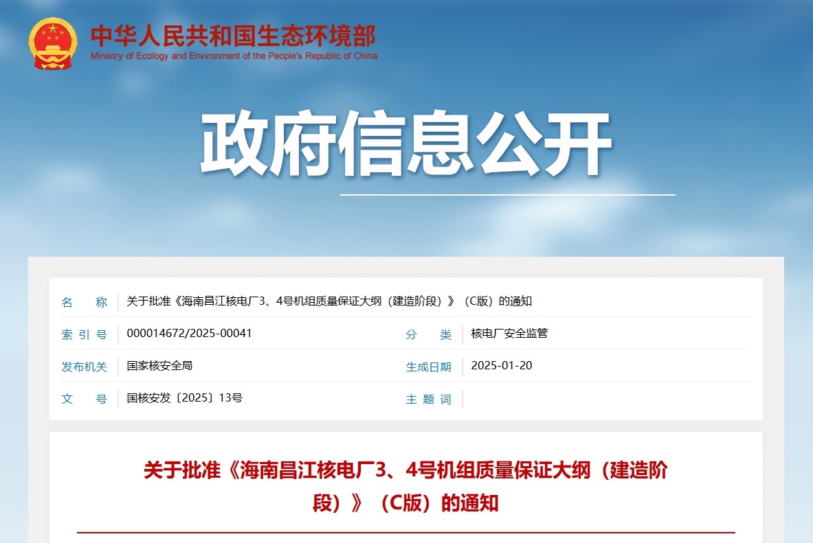 關(guān)于批準(zhǔn)《海南昌江核電廠3、4號機(jī)組質(zhì)量保證大綱(建造階段)》(C版)的通知