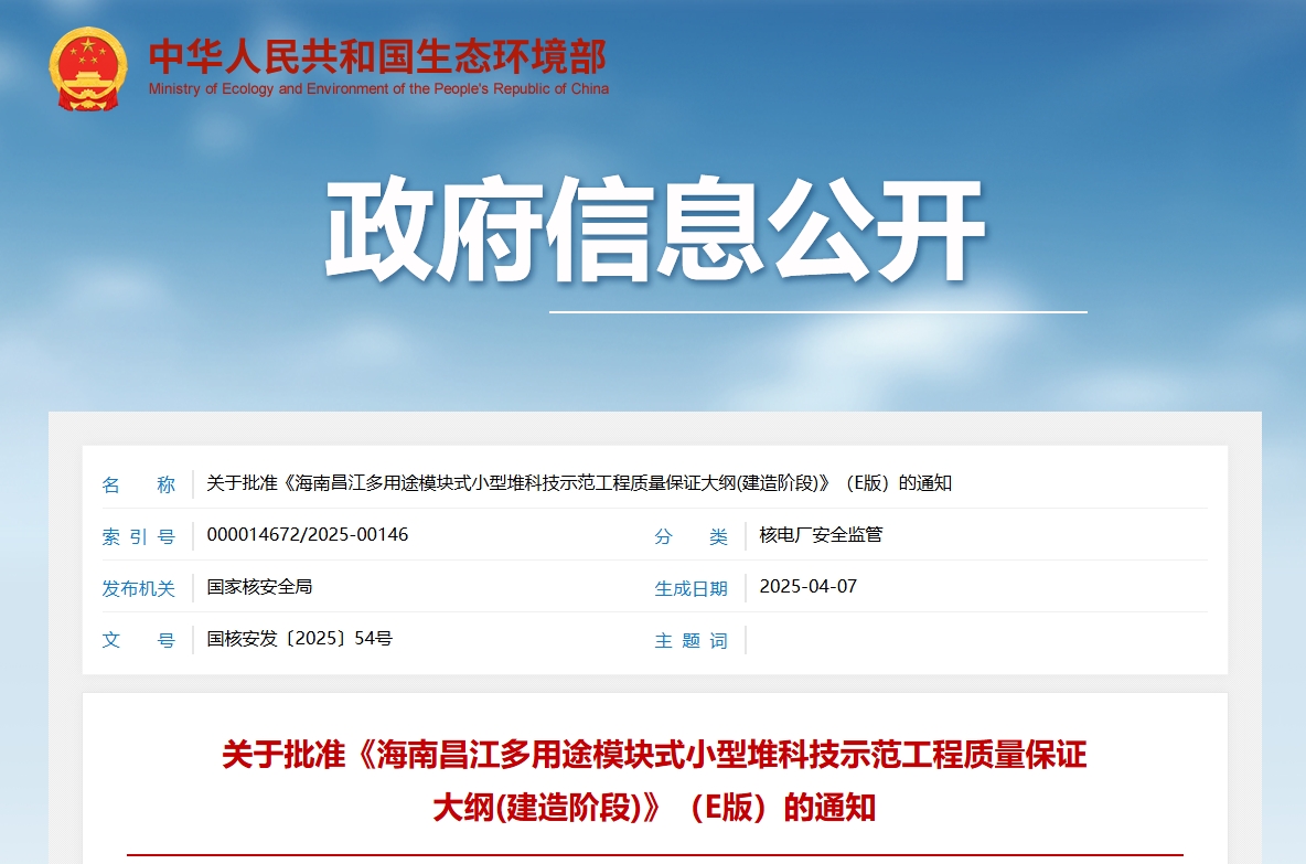 你公司《關(guān)于懇請審查海南昌江多用途模塊式小型堆科技示范工程質(zhì)量保證大綱(建造階段)的請示》(海核發(fā)〔2024〕19號)、《關(guān)于提交海南昌江多用途模塊式小型堆科技示范工程質(zhì)量保證大綱(建造階段)(報批稿)的報告》(海核發(fā)〔2025〕25號)收悉。