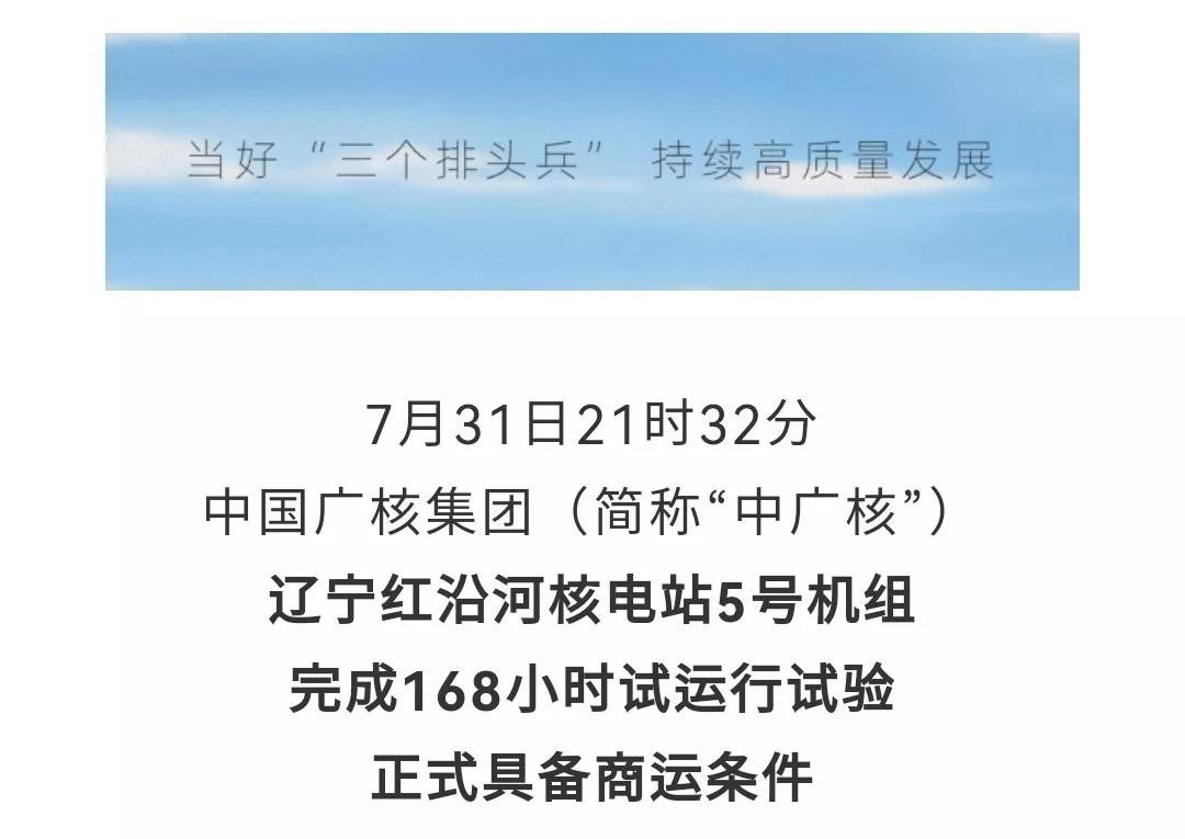 7月31日21時32分,遼寧紅沿河核電站5號機組完成168小時試運行試驗,正式具備商運條件,我國運行核電機組增至51臺。根據測算,1-5號機組全部投產,年上網電量可達375億度,環保效益相當于等效減少標煤消耗約1130萬噸,減排二氧化碳約3120萬噸。