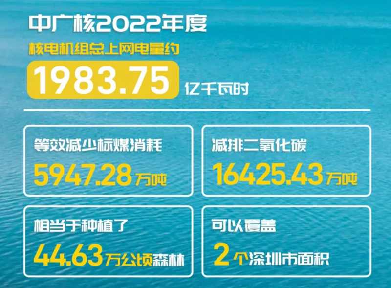 2023年1月9日,中國廣核電力股份有限公司發布信息公告,2022年1月至12月份,中國廣核電力股份有限公司運營管理的26臺在運核電機組總發電量約為2113.14億千瓦時,總上網電量約為1983.75億千瓦時,減排二氧化碳超1.64億噸,等效減少標煤消耗5947.28萬噸,相當于種植了超過44萬公頃森林。